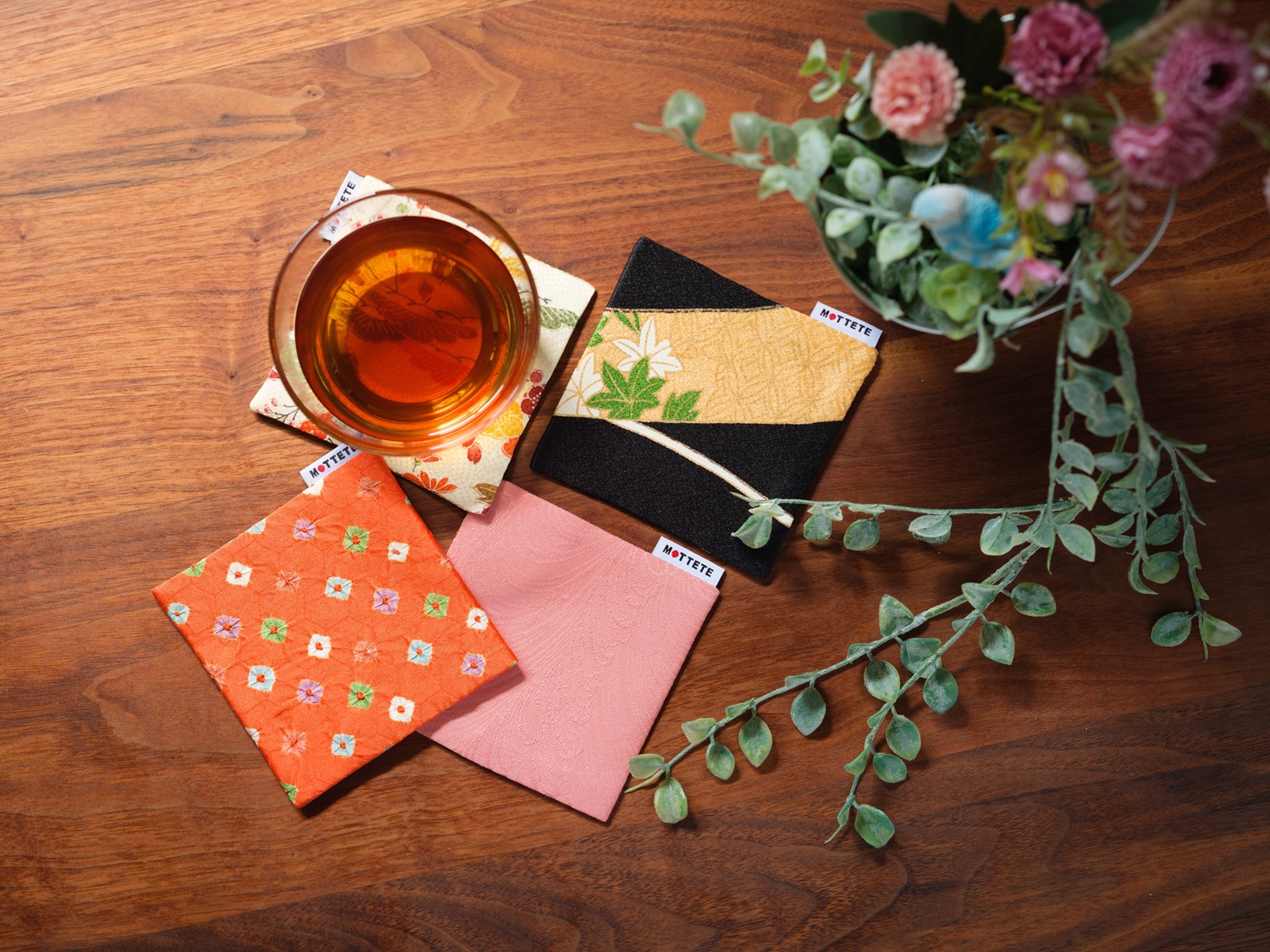 正絹反物を使って仕立てた、上品な風合いのコースターです。